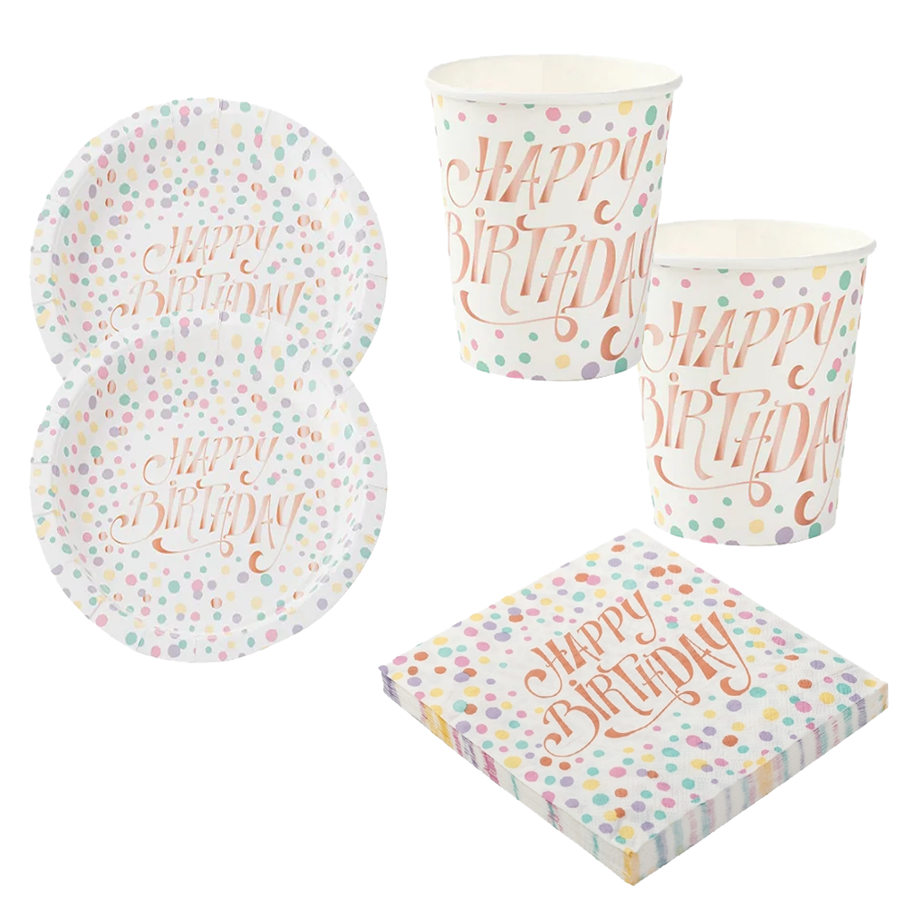 • Pratos te oferecem praticidade, copos de papel são ideais para servir bebidas refrescantes, guardanapos garantem a limpeza e higiene durante a festa